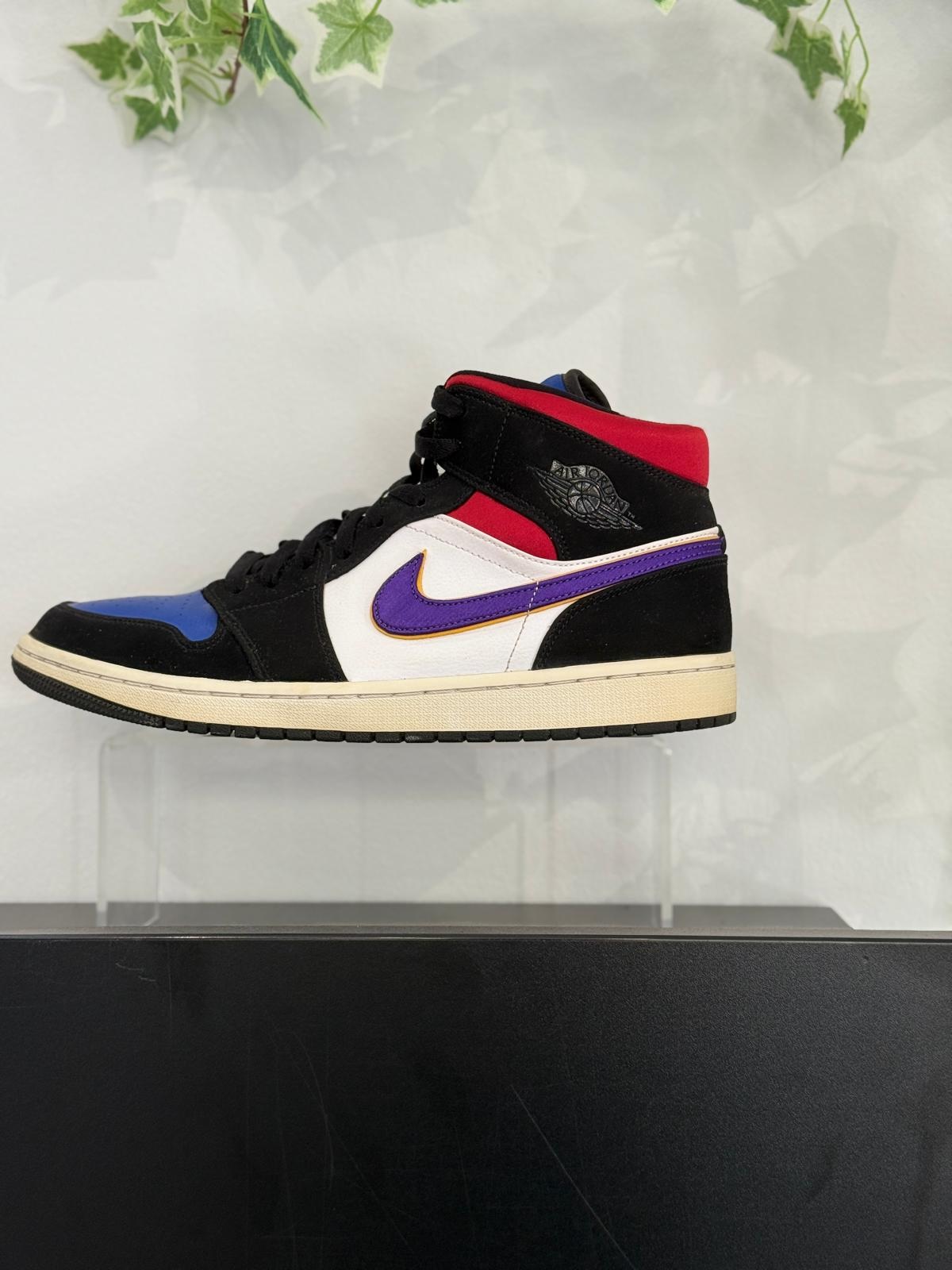 Der Nike Air Force 1 verfügt über ein Obermaterial aus Sail/Imperial Blue-Amber Rise-Black-Leder mit tiefschwarzen Details im Innenfutter. Senffarbenem Bernstein vorne und am Fersenschutz . Rote und blaue Flecken, die an verschiedenen Stellen über der Sail-Basis liegen. Von dort aus vervollständigt eine Sail-Außensohle mit Nike Air-Technologie und ein kleines schwarzes "Swoosh"-Logo das Design.