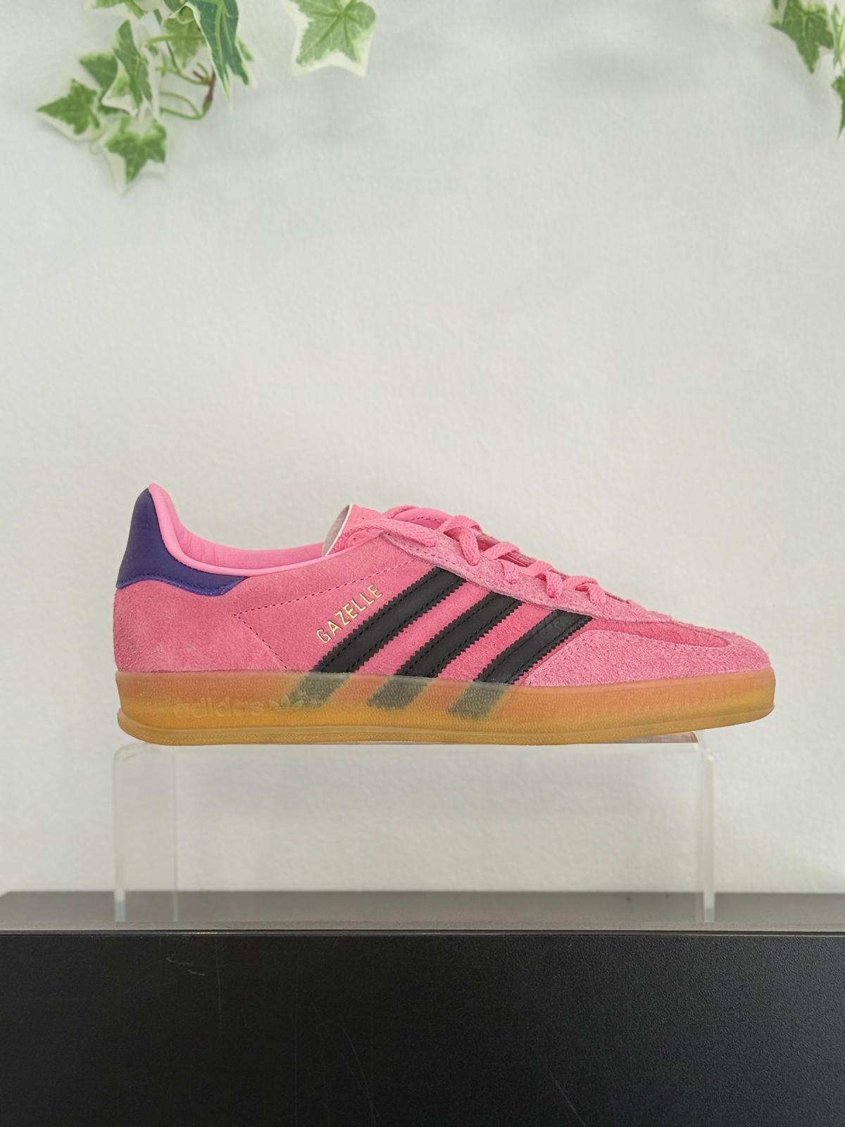 Klassischer Gazelle-Style aus Veloursleder, feminine Pinktöne, flache Sohle und dezentes Branding für Retro-Casual-Looks.