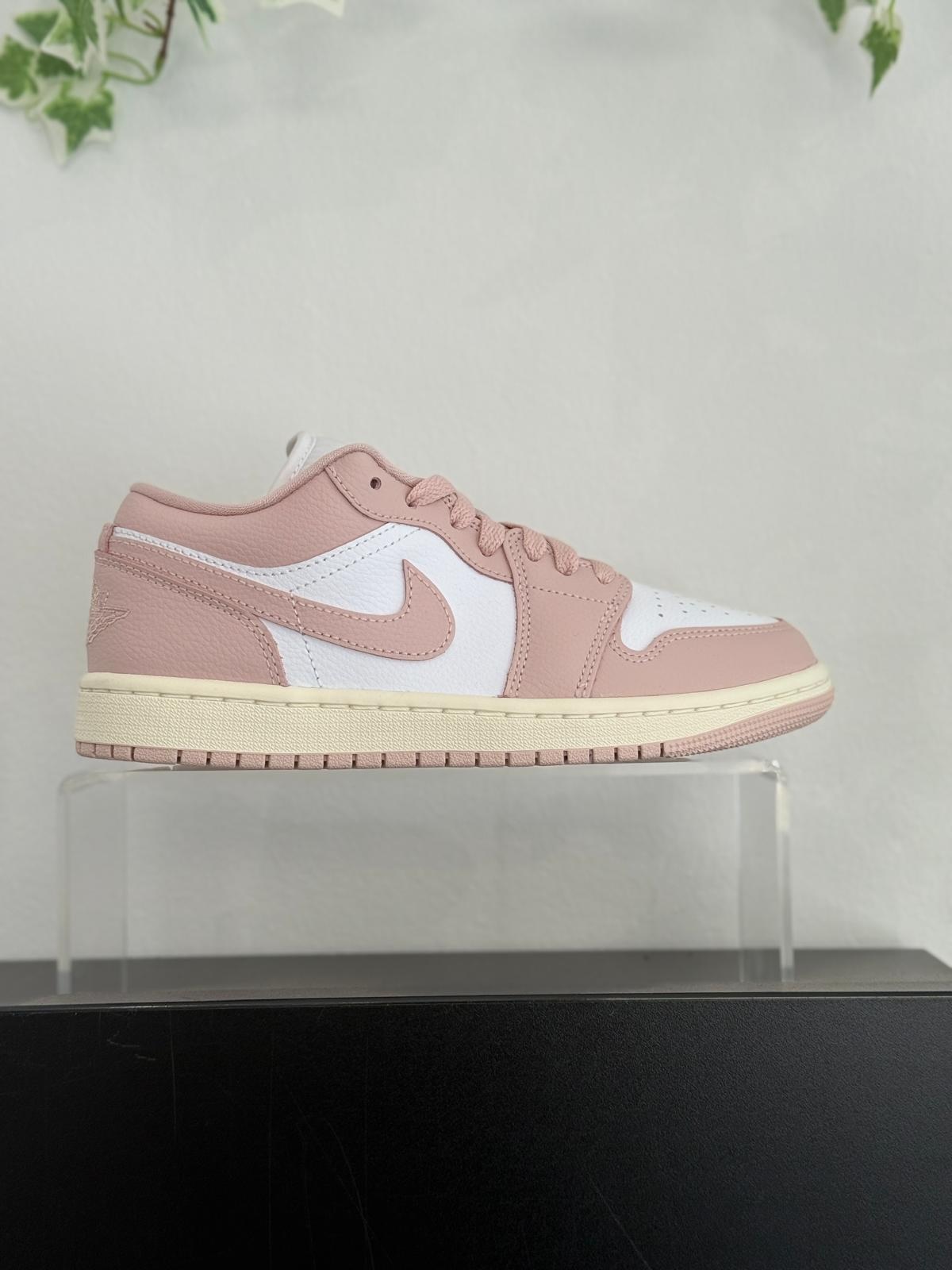 Feminine Edition des ikonischen Jordan 1 Low, hochwertiges Leder, kontrastierende Pink-Akzente, perfekte Passform für Streetwear-Styles.