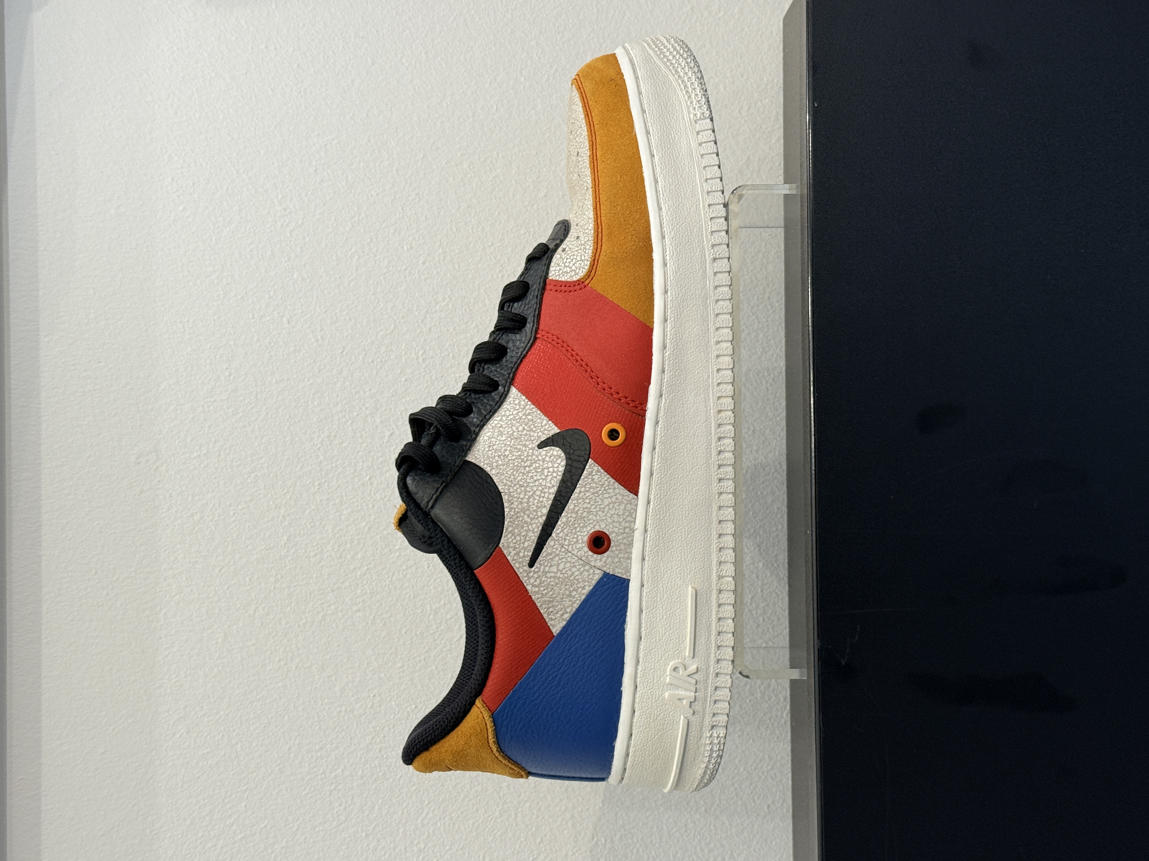 Der Nike Air Force 1 verfügt über ein Obermaterial aus Sail/Imperial Blue-Amber Rise-Black-Leder mit tiefschwarzen Details im Innenfutter. Senffarbenem Bernstein vorne und am Fersenschutz . Rote und blaue Flecken, die an verschiedenen Stellen über der Sail-Basis liegen. Von dort aus vervollständigt eine Sail-Außensohle mit Nike Air-Technologie und ein kleines schwarzes "Swoosh"-Logo das Design.